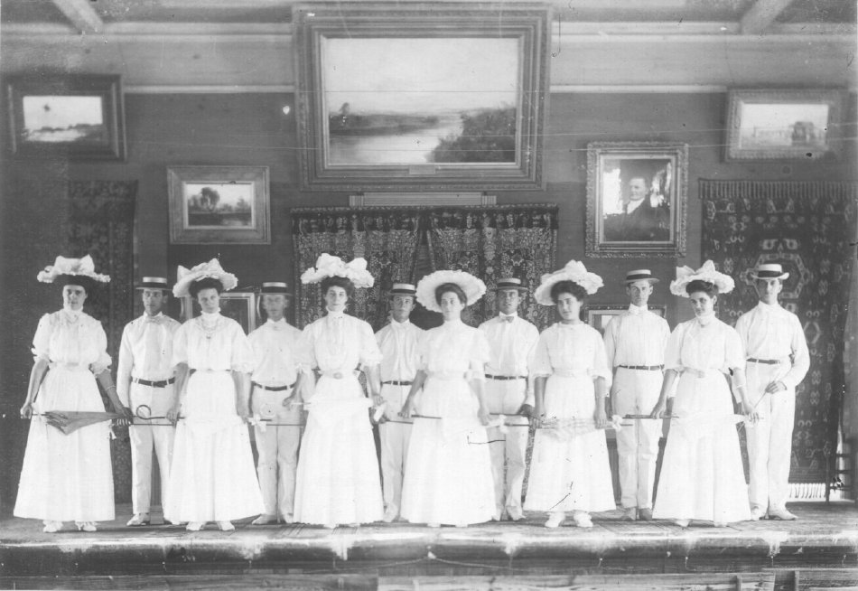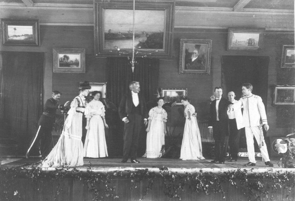 Three Koreshan women, posing on the stage of the Art Hall. They appear to be l—r Bertie Boomer, Imogene Bubbett Rahn, and Florence Graham(?).