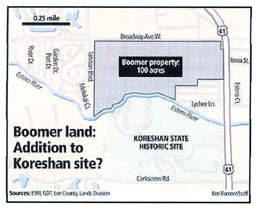 Article about sale of the Boomer home and land. Initial talks began on January 6, 2004 with "Conservation 2020" group in Lee County. Possible purchases include a joint purchase between Lee and the State of Florida.
